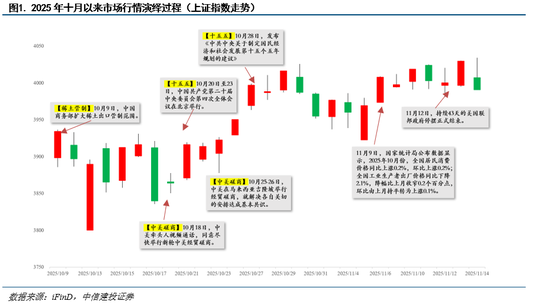 在10月8日的策略周报《假期归来,科技+黄金主线获得进一步强化》中我们指出“在经济基本面保持平稳、全球流动性宽松和中美关系改善的背景下,A股有望维持震荡向上趋势”;在10月19日的策略周报《缩量轮动继续,风格切换已起》中指出“市场进入牛市整理期,呈现资金高切低、指数横盘、缩量轮动的特征”,在11月2日的策略周报《沪指突破4000点,年末如何应对?》中我们指出“11月市场将面临新一轮横盘调整”,本周我们延续此前观点,认为后续市场或继续维持震荡轮动的状态。