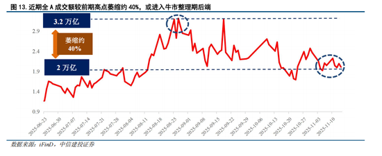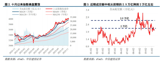 中美关系改善预期兑现,风险偏好下降。2025年10月30日中美吉隆坡会谈达成协议,关税战暂缓,市场风险偏好下降,上证指数继2025年10月29日初步突破4000点起至今单日上下涨跌幅不超过±2%,市场整体市场维持在4000点左右,成交额中枢从前期的2.5万亿下降至2万亿左右。