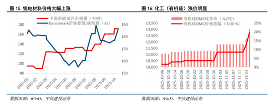 (1)景气成长线索:锂电材料、化工(有机硅、三氯化磷等)及AIDC储能电力近期因在涨价逻辑的支撑下板块呈现高景气,如2025年前三季度中国储能电池出货量已超过2024年全年水平30%,强劲的下游需求带动电解液关键材料磷酸锂价格在短期内大幅上涨。