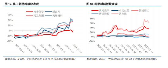(2)围绕明确景气线索进攻:近期主题投资轮动较快,其中化工新材料与超硬材料板块呈现明确景气度,可能具备较强的配置价值。以10月9日为基准,锂电材料和化工新材料板块代表个股涨价达22%和65%。